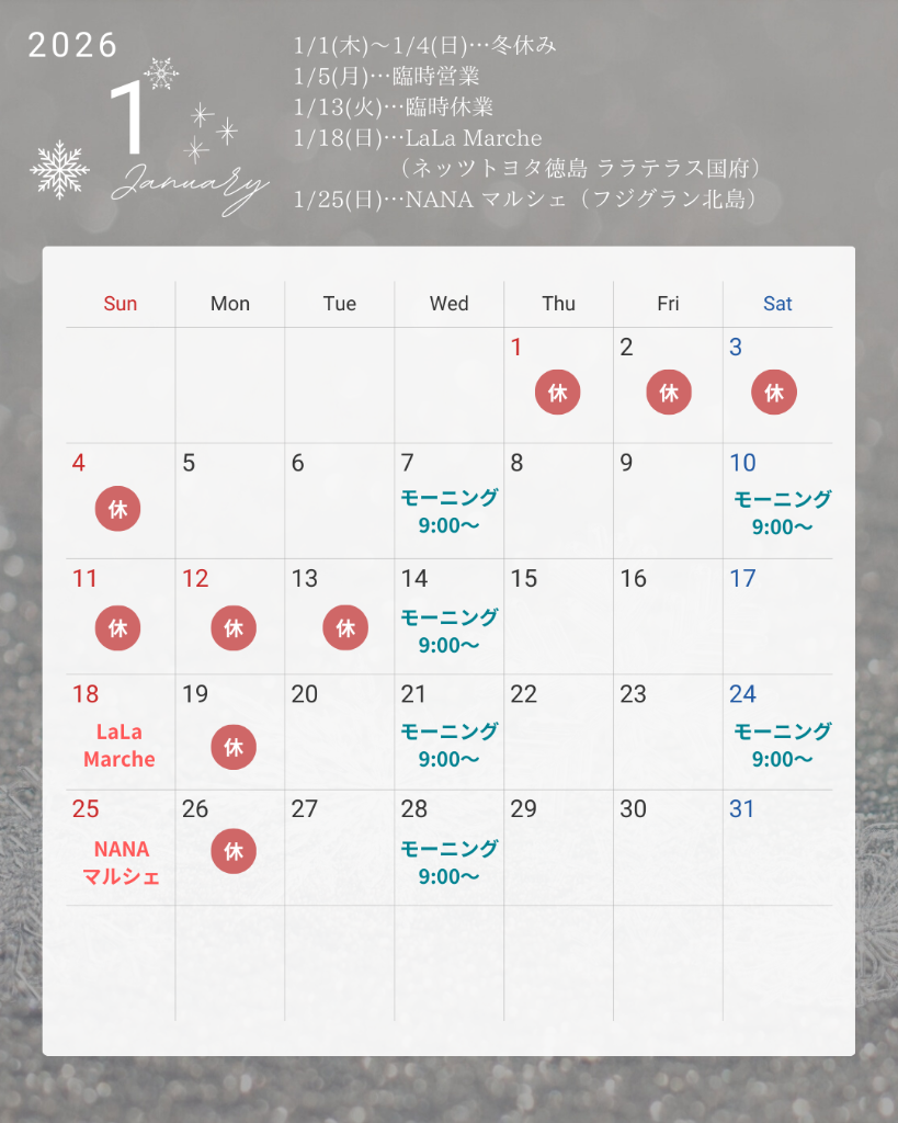1月は臨時休業や臨時営業、イベント出店がありますので、ご来店前にカレンダーをチェックしていただけるとうれしいです。